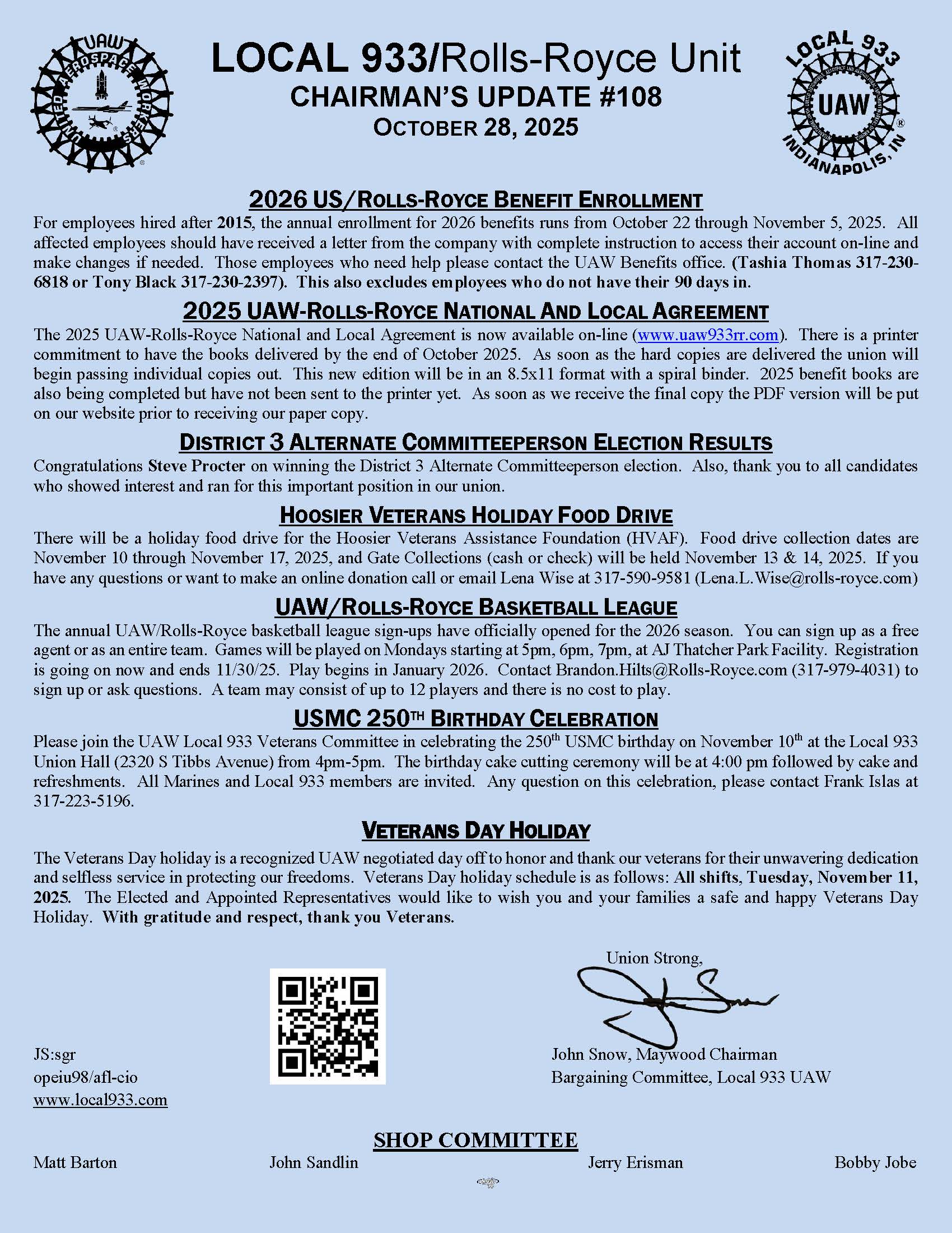 Chairman's Updates Local 933/Rolls-Royce Unit Chairman's Update #108 Matthew Mann 27 Oct, 2025 Social share icons