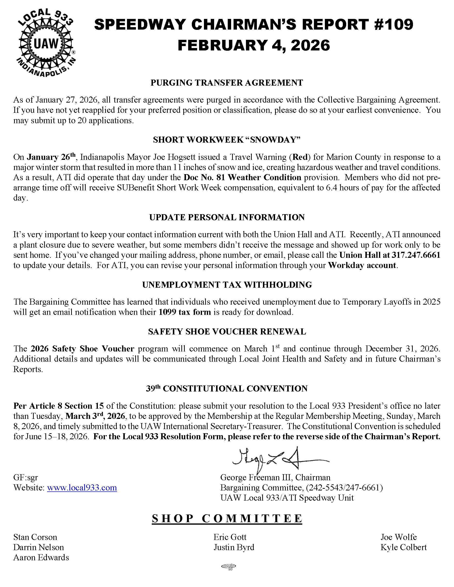 Speedway Chairman's Report #109