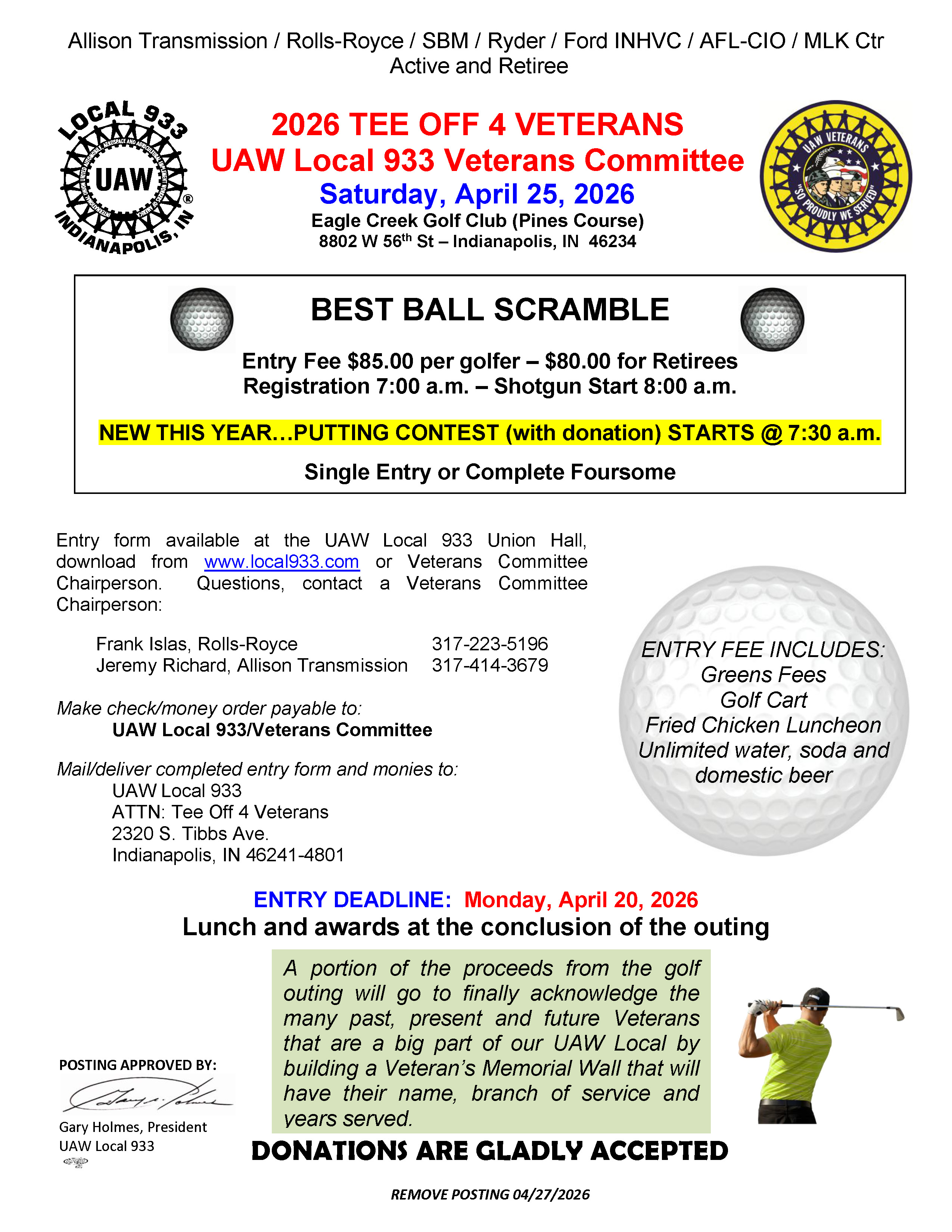 Plant Postings 2026 Tee Off for Veterans Jeffrey Jones 26 Mar, 2026 Social share icons DOCUMENT Tee Off for Veterans Registration Mar 26, 2026Tee Off for Veterans Registration