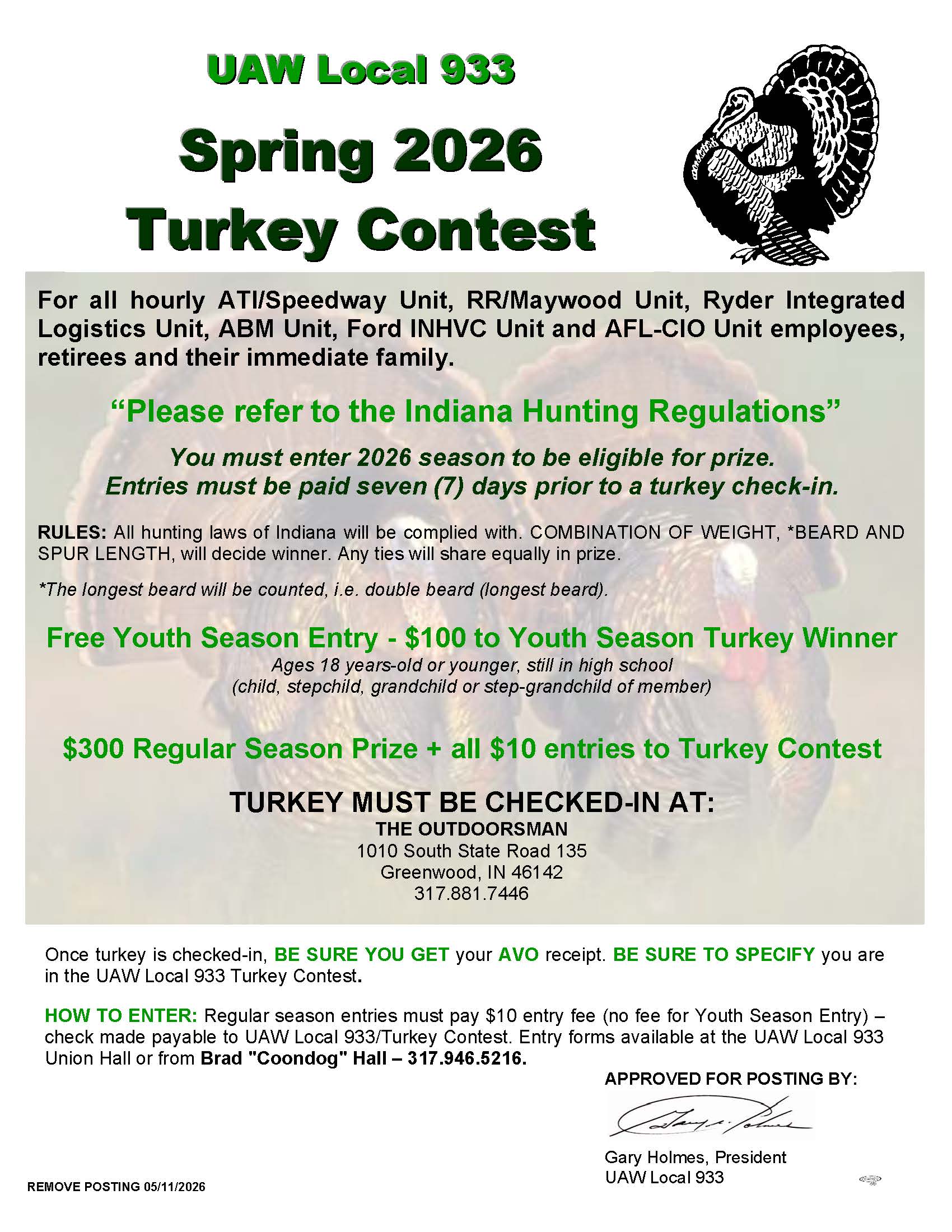 Plant Postings UAW Local 933 2026 Spring Turkey Contest Matthew Mann 03 Feb, 2026 Social share icons DOCUMENT entry_form.turkey_contest.pdf Feb 3, 2026 2026 Spring Turkey Contest Entry Form entry_form.turkey_contest.pdf
